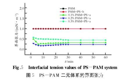 由图5结果可知,PAM单元体系以及PAMPS-b二元体系,均不能降低原油的界面张力;为了便于在图形中对比分析,将其界面张力设定为1.0 mN/m而PAM-PS-a二元体系可以将原油的界面张力维持在10-1数量级,数值与PS-a单元体系的界面张力数值相近,因此可以得出:无论是PS单元体系,还是PAM-PS复配体系,PS-b均不能降低原油的界面张力。