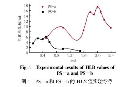 根据实验结果,按照乳化层体积最大时的待测/标准表面活性剂配比,计算出PS-a和PS-b的HLB值分别为13.5和12.0。PS-b的HLB值小于PS-a的HLB值,表明PS-b的亲水性比PS-a的亲水性小。根据Davis法计算HLB值的原理,可知: