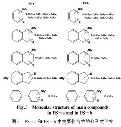 对于PS-b,相对含量较大的20个化合物中,按照相对含量大小依次为:烷基萘磺酸盐(C17~C21)、烷基苯磺酸盐(C17~C24)、烷基茚满磺酸盐(C17~C21)、烷基四氢萘磺酸盐(C19~C20);而对于PS-a,按照相对含量大小依次为:烷基苯磺酸盐(C11~C13、C18~C23)、烷基萘磺酸盐(C12、C18~C20)、烷基茚满磺酸盐(C16~C18)、烷基四氢萘磺酸盐(C13、C17~C18)。