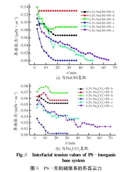 由图6可以看出:PS-b与NaOH复配,原油的界面张力只可以降到10-2数量级,而PS-a与NaOH复配,可以将原油的界面张力降至10-4数量级;PS-b与Na2CO3复配,原油的界面张力可以降到10-2数量级;PS-a与Na2CO3复配,可以将原油的界面张力降至10-3数量级。综上分析可以得出:PS-b的界面活性远远低于PS-a;PS-a的复配体系可以达到超低界面张力(10-3~10-4mN/m),而PS-b不能。