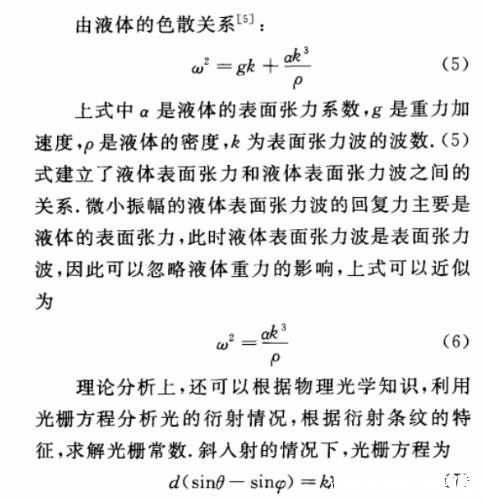 d为光栅常数,在此情况下,光栅常数即为液体表面张力波的波长,θ为斜入射角,φ为衍射角,k为衍射级次,λ为光波的波长。通过测量观测距离、衍射条纹的间距等量可求出衍射角和光栅常数。再根据液体的色散关系(5)式,求得液体表面张力。具体的测量和求解过程,这里不再赘述。