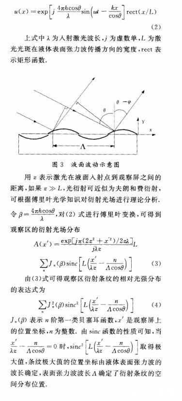 (2)理论上分析了表面张力波的光衍射效应,得到了衍射光场的解析表达式。根据衍射光场和表面张力波之间的关系,进一步可求得液体的表面张力系数。