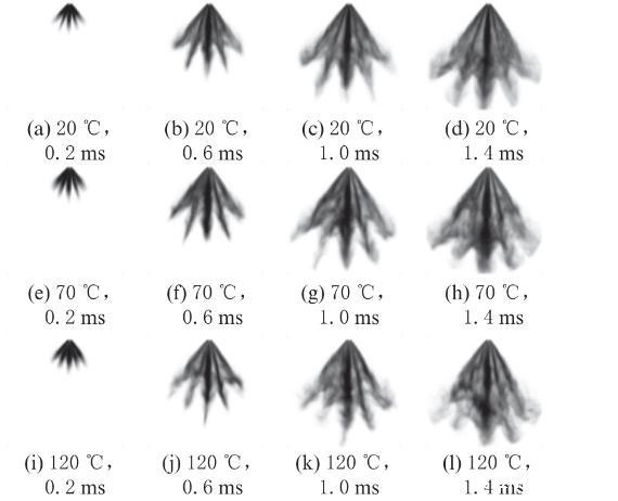 图4不同环境温度和喷雾开始后时刻下甲醇的喷雾形态