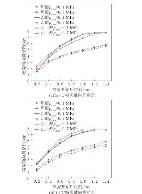 随着环境压力和温度的上升,各燃料的轴向贯穿距缩短。这是因为当定容弹内的气体压力与温度上升时,燃油液滴的显热会随之增大,加速了燃油的蒸发过程,从而导致喷雾在轴向扩散受到抑制,使喷雾的轴向贯穿距离缩短。