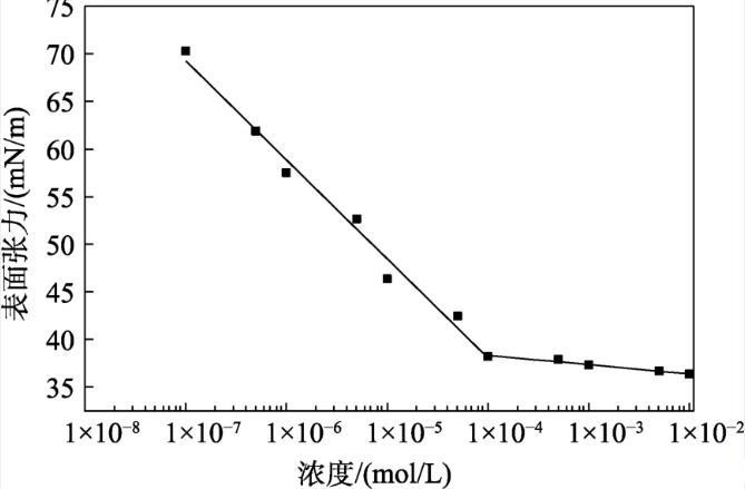配制不同浓度TAC水溶液,测定温度298.15 K,绘制溶液的表面张力随浓度的变化曲线。在某一浓度前后,表面张力-浓度曲线会形成两条斜率不同的直线,这两条直线的交点即为临界胶束浓度(CMC)。