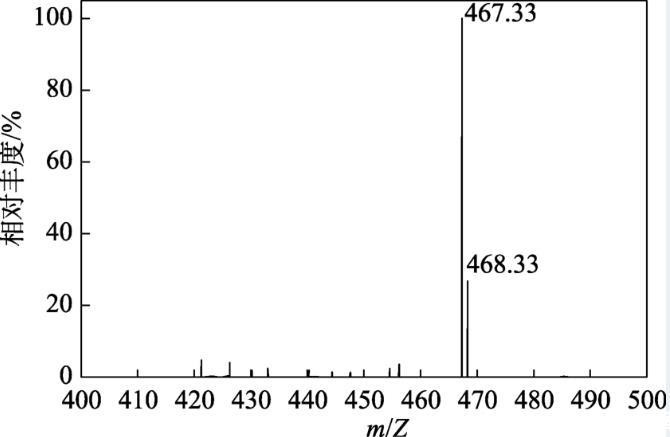 图4为TAC的MS谱图。从图4可以看出,在正离子检测模式下检测到最大丰度的质谱信号为m/Z=467.33,m/Z=468.33为[M+1],即正峰MS信号。TAC相对分子质量测量值与计算值一致。