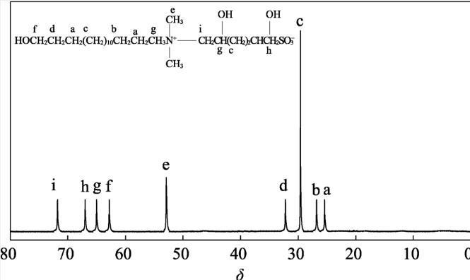 图3为TAC的13 CNMR谱图。从图3可以看出,δ25.6(a)为—CH 2—中C sp 3的共振吸收峰;δ26.8(b)为—CH 2—中C sp 3的共振吸收峰;δ29.6(c)为—(CH 2)10—中C sp 3的共振吸收峰;δ32.2(d)为—CH 2—中C sp 3的共振吸收峰;δ52.9(e)为CH 3—N—CH 3中C sp 3的共振吸收峰;δ62.8(f)为—CH 2—OH中C sp 3的共振吸收峰;δ65.0(g)为—N—CH 2—中C sp 3的共振吸收峰;δ67.0(h)为—CH 2—SO–3—中C sp 3的共振吸收峰;δ71.8(i)为—N—CH 2—中C sp 3的共振吸收峰。