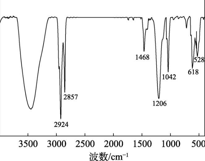 图1为TAC的FTIR谱图。从图1可以看出,2924 cm–1处为主链甲基的C—H键的伸缩振动吸收峰;2857 cm–1处为主链亚甲基C—H键的伸缩振动吸收峰;1468 cm–1处为甲基和亚甲基C—H键的面内摇摆振动吸收峰;1206 cm–1为磺酸基团中C—S键的不对称伸缩振动吸收峰;1042 cm–1处为胺基C—N键的面内弯曲振动吸收峰,表明TAC结构中存在季铵基。618和528 cm–1处为—SO 3-的中强吸收峰,表明TAC结构中存在磺酸基。上述结果表明,TAC符合预先设计的结构。