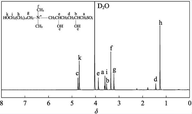 图2为TAC的1 HNMR谱图。从图2可以看出,δ3.60(a)为TAC中—CH 2 SO–3的质子峰,δ3.50~3.87(b、e)为TAC中—CH—的质子峰,δ4.70~4.77(c、k)为TAC中—OH的质子峰,δ1.40(d)为TAC中—CH 2 CH 2—的质子峰,δ3.30(f)为TAC中N—(CH 3)2的质子峰,δ3.22(g)为TAC中N—CH 2的质子峰,δ1.26(h)为TAC中—(CH 2)14—的质子峰,δ3.62(i)为TAC中—CH 2—的质子峰。