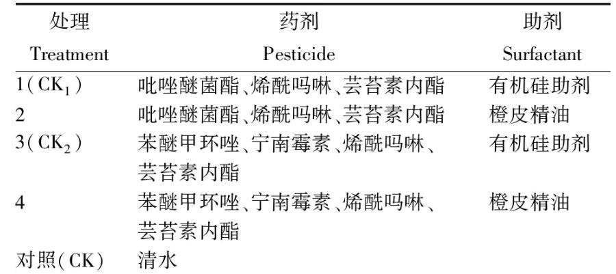 采用躺滴法测试接触角。选取新鲜、干净的辣椒叶片,避开叶脉、病斑等在平整部分剪取大小不超过载玻片的小块粘在载玻片上,并平放在接触角测量仪的样品台上,吸取不同农药及助剂稀释液2μL分别滴于叶块上,以去离子水为对照,利用光学视频接触角测量仪的视频功能记录0~60 s内液滴接触角变化,温度控制在(25±0.5)℃,并选取60 s时的接触角为静态接触角。3次重复,计算平均值。