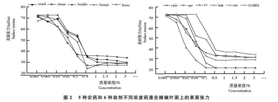 从图2看出,随着药液浓度增加,5种农药和6种助剂药液在辣椒叶面上的表面张力呈逐渐减小趋势。