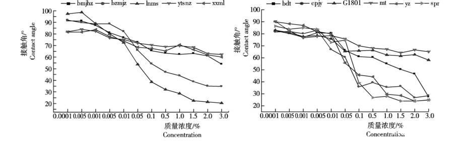 图1 5种农药和6种助剂不同浓度药液与辣椒叶面的接触角