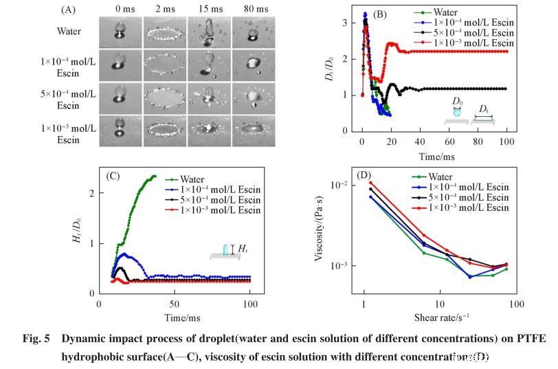 液滴在固体表面的弹跳行为由液体性质和固体表面性质共同决定,通常对于特定场景,固体表面性质多是固定不变的,因此主要通过改变液体的性质(黏度、表面张力)来调控液滴的弹跳行为.为了考察七叶皂素抑制液滴回缩过程中,液体黏度是否起到一定作用,测定了水和不同浓度七叶皂素溶液的黏度.如图5(D)所示,所有样品的黏度随剪切速率的增加会先下降后达到平衡,不同样品的黏度结果相似,无明显差异。