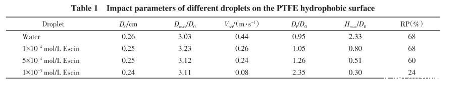 从图5(B)和(C)及表1可以看出,不同液滴在疏水表面上发生撞击后均发生相似程度的铺展,之后发生回缩.水滴回缩速率(0.44 m/s)较大,且回缩百分比达到68%.向水中加入少量七叶皂素,浓度为1×10-4mol/L时,回缩速率(0.26 m/s)明显降低,但回缩百分比没有明显改善.随着七叶皂素浓度增大,液滴回缩明显减弱.浓度为1×10-3mol/L时,回缩速率低至0.08 m/s,且仅液滴的24%发生回缩,可以认为达到了很好的抑制回弹的效果.而考察弹跳情况时发现,水滴因完全弹起离开表面,所以Hmax/D0最高达到2.33.与之相比,七叶皂素加入后,明显抑制了液滴的弹起,且随着浓度增大,抑制作用明显增加.