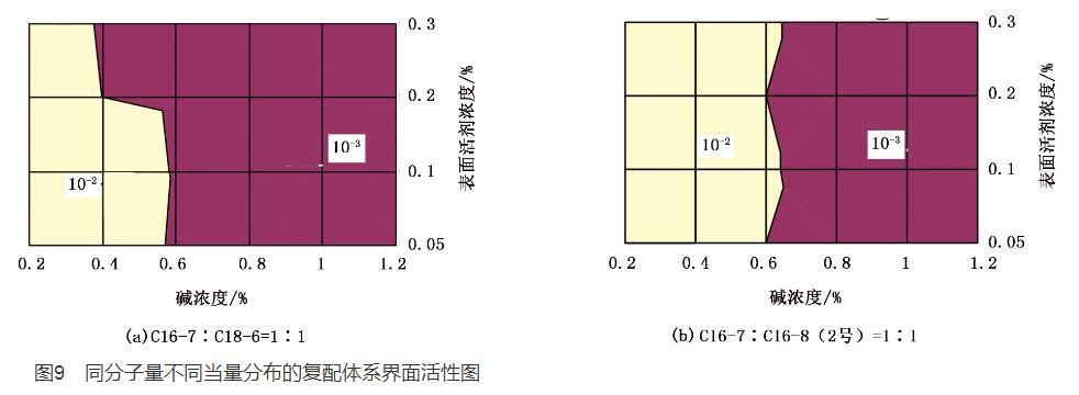 2)同分子量不同当量分布的表面活性剂界面活性范围从图8和图2对比可以得出,表面活性剂平均相对分子量为432时,C18-6测得表面活性剂与碱浓度范围很宽的超低界面活性范围,而C16-8(2号)超低界面活性范围的碱浓度相对于C18-6变窄。同理,在试验用表面活性剂的复配体系中,试验图9表明平均相对分子量为425时,C16-7与C18-6的复配体系形成超低界面活性范围宽于C16-7与C16-8(2号)的复配体系。说明平均相对分子量相同当量分布不同的表面活性剂界面活性范围也不相同。