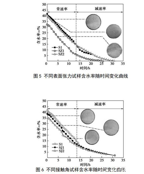 把筛好的土放入105℃烘箱内烘至恒重备用。设计土样的干密度为1.5 g/cm3,含水率计算不考虑酒精溶液和肥皂水引起的液体密度变化,制样含水率为16%~18%。采用轻型击实仪制圆柱试样,试样直径为102 mm,高40 mm,试样制好后用真空饱和法进行饱和,其中,SZ1样用20%酒精溶液饱和,SZ2样用浓度为2 g/L的肥皂水饱和,其余试样均为纯水饱和,抽气时间为6 h,试样在真空下的浸泡时间为12 h。为缩短试样的脱湿时间以减小酒精挥发造成的浓度降低,饱和试样脱湿采用低温烘干法,烘箱的温度控制在50℃(小于酒精的沸点和十八胺的熔点),当2h内试样的质量变化量不超过2 g时停止试验。试验开始后,前8 h每隔30 min把试样从烘箱中取出后先称重,随后进行拍照记录,称重和拍照的时间控制在30s内,拍照结束后把试样放入烘箱继续脱湿,6 h以后拍照间隔时间增加为1 h。2试验结果2.1水分蒸发与临界含水率图5给出了不同表面张力的3种试样含水率随时间变化的关系曲线。