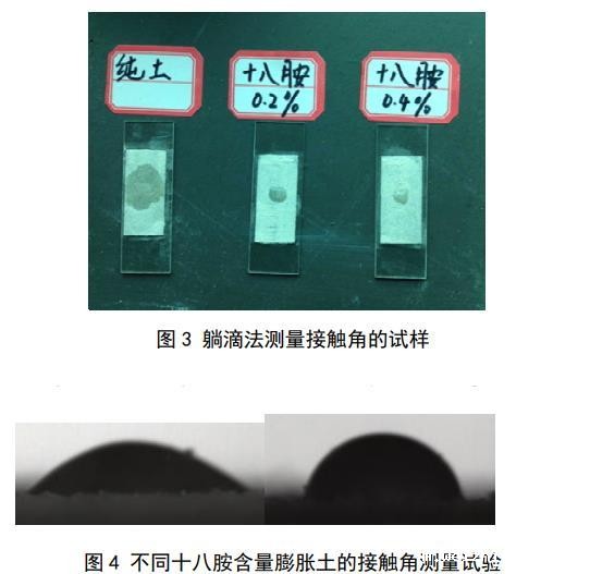 目前测量粉体接触角(包括土颗粒)的方法主要有3种:躺滴法、毛细管上升法和Wilhelmy平板法,其中,躺滴法测出的接触角为介于前进接触角和后退接触角之间的表观接触角,毛细管上升法测出的接触角为前进接触角,Wilhelmy平板法测出的接触角为前进接触角或后退接触角。土体开裂是一个相对较慢的过程,因此土颗粒与孔隙水的接触角大部分时间应该处于前进接触和后退接触角之间的某一表观接触角。所以,本文采用躺滴法对土颗粒接触角进行测量。土样烘干后过0.075 mm的筛,取长度为4 cm左右的双面胶带贴到载玻片上,将筛好的土颗粒均匀覆盖载玻片,并用重量为200 g的砝码压住载玻片,持续时间为2 min,移开砝码后反复轻轻磕碰载玻片以去除多余的土颗粒,直到胶带表面覆盖有一层薄薄的土颗粒,且土颗粒分布均匀无明显凸起。如图3所示,当水滴滴到被纯土覆盖的胶带上时,液滴迅速扩散开,此时土颗粒的亲水性很好,接触角趋近于0。水滴滴到另外两个覆盖着混有十八胺土样的载玻片时,形成了小液滴,此时固–液界面和气–液界面之间的夹角不为0,把这2块载玻片分别放到试验台上进行液滴在土颗粒表面的表观接触角测量,液滴初始体积为5μL,测量仪器为JC2000型接触角测量仪,如图4所示,每个土样的接触角反复测量5次后取平均值。十八胺含量为0.2%土样的接触角为30.5°,十八胺含量为0.4%土样的接触角为60.2°。