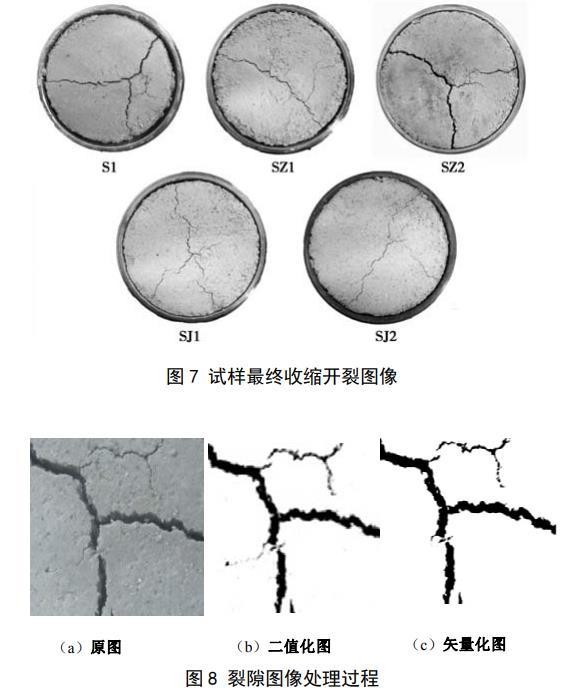 图7给出了5个试样在脱湿结束后对应的收缩开裂图像。从图中可以看出,每个试样均出现了不同程度的收缩裂隙,各试样表面裂隙最终形态具有大致相似的规律:3条裂隙相交于一点,把圆形表面分成了3个部分,S1样和SZ2样的裂隙较宽,试样开裂明显,其余试样裂隙发育不明显,裂隙在形成过程中先形成一条主裂隙,主裂隙发育过程中支裂隙开始发育,最终支裂隙和主裂隙相交形成3条裂隙。S1样和SZ1样不仅出现了裂隙,在试样和钢环接触的地方还出现了明显的分离,试样出现了体缩,其余试样也出现了不同程度的体缩,但并不明显。为得到试样的裂隙度,先要对采集到的试验开裂图片进行图像处理,如图8所示,先对采集到的膨胀土干缩过程图像进行二值化,去除一些非裂隙杂点,再把二值化图像进行矢量化,矢量化后的图像通过AUTOCAD提取试样收缩面积和裂隙面积,最后计算出试样的收缩开裂裂隙度: