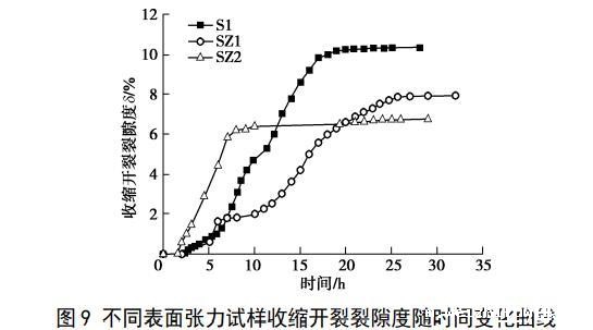 图9不同表面张力试样收缩开裂裂隙度随时间变化曲线