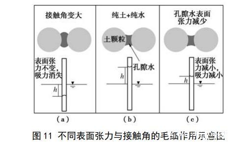 3.1接触角和表面张力抑制膨胀土裂隙发育的机理分析从前面的试验可知,减小孔隙水表面张力或增大土颗粒与孔隙水间的接触角都可以抑制膨胀土的干缩开裂,然而,增大接触角对膨胀土收缩开裂的抑制效果明显好于减小孔隙水表面张力。结合图11的颗粒模型和毛细管模型对其机理进行分析。当土颗粒间由液桥连接时(对应于非饱和土中的水封闭状态),其基质吸力为1 21 1r r。(3)式中为液体的表面张力,r1和r2是任意一对相互垂直的平面在液面上所截取曲线的曲率半径,当曲率中心在液体侧时其值为“负”,反之为“正”。设为“正”时表示吸引,为“负”时表示排斥。传统的非饱和土力学中,基质吸力都大于零,不会是负值。这是因为:在岩土工程领域中,通常把岩土体都视为完全亲水性材料,即孔隙水与土颗粒的接触角为0,即使在模型计算时所涉及的接触角也是比较小的,这种情况下基质吸力只可能为正,即:非饱和土中只存在负的孔隙水压力。