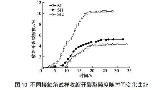 图10不同接触角试样收缩开裂裂隙度随时间变化曲线