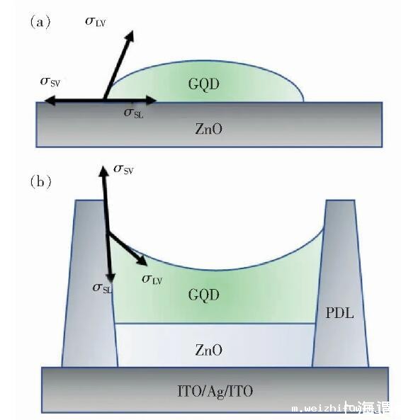 图2量子点墨水在ZnO衬底上的接触角示意图。(a)墨水在平坦ZnO衬底上的接触角示意图;(b)墨水在旋涂了ZnO的像素坑基板接触角示意图。