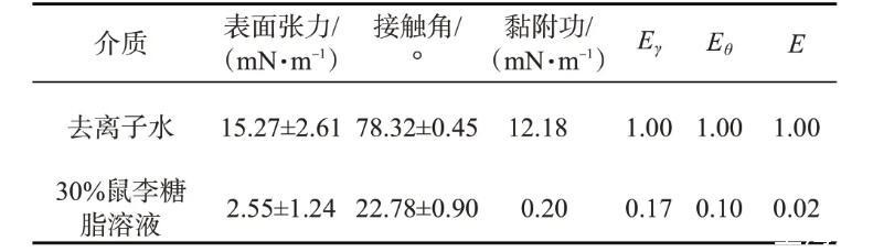 基于接触角测量法中的LW-AB法,参考韩玉香等的研究,首先分别测试3种溶液(去离子水、丙三醇和二碘甲烷)在亲油玻片及30%鼠李糖脂溶液处理后的亲油表面的接触角;然后结合3种溶液的表面张力及其分量值(表1),按照参考文献中式1-38至式1-42,分别测算固体的表面能中Lifshits-van der waals分量、以及Lewis酸分量和碱分量;最后按照参考文献中式1-37计算亲油玻片及30%鼠李糖脂溶液处理后的亲油表面自由能γS。
