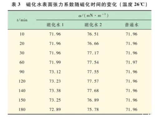 表3磁化水表面张力系数随磁化时间的变化(温度26℃)