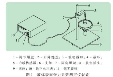 一个金属环固定在传感器上,将该环浸没于液体中,并渐渐拉起圆环,当它从液面拉脱瞬间传感器受到的拉力差值,即液体表面张力为