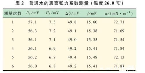 用游标卡尺测量金属圆环:外径D1=3.500 cm,内径D2=3.334 cm,调节上升架,记录环在即将拉断水柱时数字电压表读数U1,拉断时数字电压表的读数U2,结果见表2。求平均值得出此温度下普通水的α=71.96 mN/m。