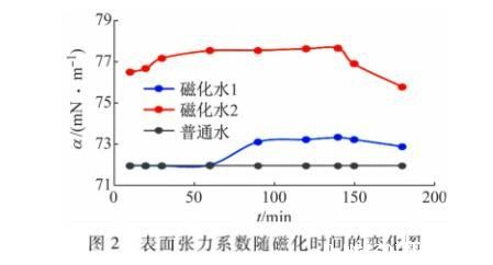 (1)从图表可以看出,磁化水2在最初的前60 min内表面张力系数有了较大的变化,最大差值为7.8%