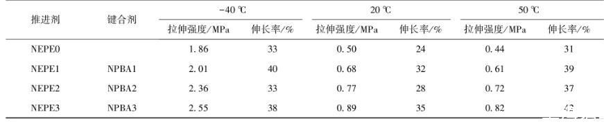 分别在-40℃、20℃、50℃温度条件下,采用单向拉伸实验得到了含与不含NPBA推进剂的最大拉伸强度σm和最大伸长率εm,其结果见表6.