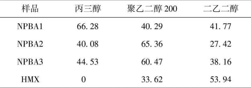 由表5可知,NPBA3与HMX的粘附功最大(113.34 mN/m),且界面张力最小(4.81 mN/m),表明3种NPBA中NPBA3与HMX的浸润性(粘结性)最好,且外力破坏粘接界面需做的功(粘结强度)最大。与NPBA1相比,虽然NPBA2与HMX的粘附功相对较大(分别为75.06 mN/m和78.38 mN/m),但其界面张力相对也大(分别为21.51 mN/m和24.12 mN/m),表明NPBA2与HMX的粘结强度大于NPBA1,但浸润性略弱。