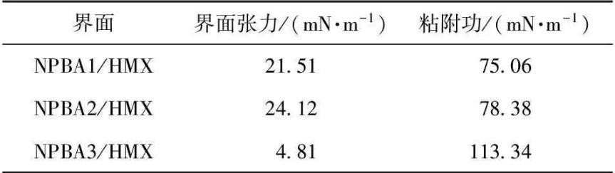 计算得到3种NPBA分别与HMX之间的粘附功WAB.界面张力和粘附功计算结果见表5.