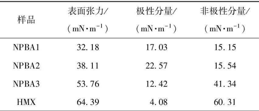 采用动态接触角测试仪的Wilhelmy吊片法和Modified washburn法,分别测试了合成的3种NPBA和HMX在不同液体中的接触角θ,结果见表3.
