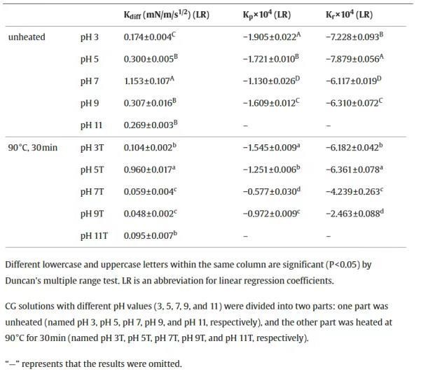 Kdiff、Kp和Kr的最高值分别为pH值7、3和5。柔性蛋白可以在油水界面上更快地吸附和重新排列。pH为3时CG灵活的二级结构,使其具有更好的吸附动力学,。pH 5(接近pI 4.3)的CG更弱的静电斥力,引起了更好的结构重排。加热后,除pH值为5时CG的Kdiff外,所有样品的Kdiff、Kp和Kr均有所下降。加热后的CG具有较低的初始界面张力和较短的平衡吸附时间(图1a),它能迅速达到平衡状态,并且吸附动力学指数较低。此外,加热后的CG表现出显著的变性和聚集,残留的蛋白质分子会产生空间位阻,从而阻碍聚集后的CG到达油水界面。此外,不溶性CG聚集体对残留CG分子的吸附产生了屏障。CG在pH为5时,蛋白质形成大量沉淀,溶解度仅为12.05%。可溶性蛋白含量低意味着较弱的静电排斥力,这使剩余的蛋白更容易扩散,从而导致最高的Kdiff。与动态界面张力相比,CG与pH 5T的吸附动力学不受蛋白质浓度的影响。