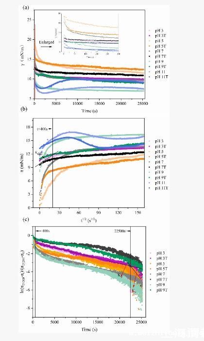 预实验验证蛋白质在界面的吸附行为:通过动态界面张力曲线(γ-t)判断是否达到平衡(斜率趋近于0),若长时间不稳定(如持续下降),可能是蛋白质未完全溶解或溶液中有杂质。