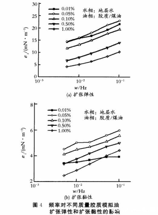 图4频率对不同质量胶质模拟油扩张弹性和扩张黏性的影响