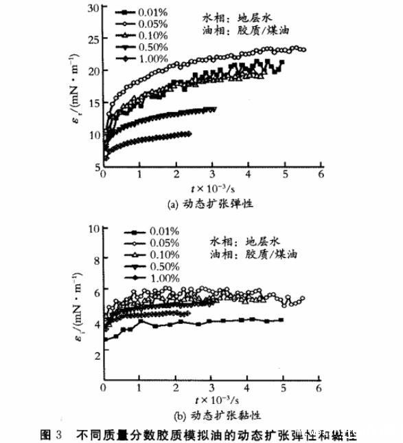 图3不同质量分数胶质模拟油的动态扩张弹性和黏性