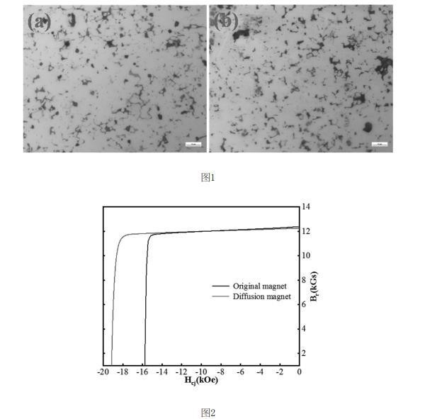 钕铁硼磁体因具备高磁能积、高矫顽力等优异的磁学性能已被广泛应用在电子信息、新能源汽车、风力发电等领域。随着科技的进步,市场对钕铁硼磁体的磁性能提出了更高的要求。传统的高矫顽力磁体制备方法需要使用大量的重稀土元素(Dy/Tb),不但增加了成本,同时还造成剩磁和最大磁能积的下降。而晶界扩散工艺在实现大幅度提升矫顽力的同时可以保证剩磁几乎没有损失,是高矫顽力钕铁硼磁体降低成本的重要制备方法。根据烧结钕铁硼永磁体的矫顽力机制,反磁化畴首先在晶粒表面形成,晶粒表面是磁体内最薄弱的环节,提高晶粒表面的各向异性场可以推迟反磁化畴核的形成,从而提高整个磁体的矫顽力,晶界扩散就是基于这一原理提出的。
