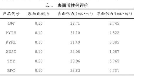 由表2可知,3种表面活性剂均具有较好的降低表面张力效果,在较低浓度时就达到了较低表面张力,且随着浓度的增加表面张力趋于平稳;3种表面活性剂按降低表面张力性能由高到低排序依次为PYKL、XXSD和BFC。