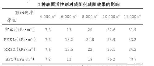 选用HLBT减阻剂,测试了3种表面活性剂对减阻剂减阻效果的影响(见表3)。