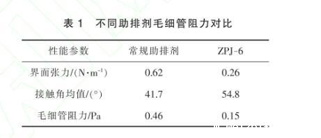 毛细管力的作用使流体流动阻力增加,导致压裂后压裂液返排困难。如果地层压力不能克服毛细管力,压裂液滤液和残渣吸附在裂缝表面,造成储层孔隙堵塞和压裂液无法返排,就会致使渗透率降低,伤害储层。为了减少压裂液在地层的停留时间,须使用助排剂,降低压裂流体的表面张力。以降低油水相间界面张力、增大与岩心表面接触角两方面为目标,选取不同助排剂进行对比(见表1),优选出具有较佳界面张力与接触角平衡值的新型助排剂ZPJ-6。与常规产品相比,新型助排剂具有较低的界面张力和较高的接触角,毛细管阻力相对减小。