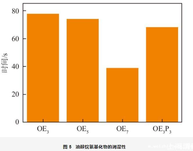 采用帆布片沉降法进行润湿性测定过程中,帆布片在表面活性剂溶液中的沉降时间越短,润湿力越好。0.01 mol/L油醇烷氧基化物的润湿性如图5所示。从图中可以看出,随着EO加合数的增加,OEn的润湿时间逐渐减小,润湿性逐渐增强。当帆布片浸入表面活性剂溶液中后,表面活性剂首先从溶液中快速迁移到纤维表面形成有效吸附层,表面活性剂的尾链会吸附在疏水表面上,而亲水头基朝向水相产生亲水现象,有利于润湿。EO基团为亲水基,分子结构中EO基团越多,表面活性剂分子与水的相互作用越强,润湿性越强。当在OE3中引入PO基团后,润湿时间由78 s降低至68 s,润湿性增强。PO基团为中等极性基团,分子中引入PO基团后,既不减弱分子的亲水性又提高了其疏水性,使其与纤维的相互作用增强,同时PO基团的支化结构有利于其在织物表面的渗透,增强了润湿性。表面活性剂分子在水溶液中迁移的速率越快(动态表面活性越强),越容易扩散到纤维表面,越有利于润湿。油醇烷氧基化物的润湿性顺序为:OE3<OE5<OE3P3<OE7,与动态表面张力测定结果一致。