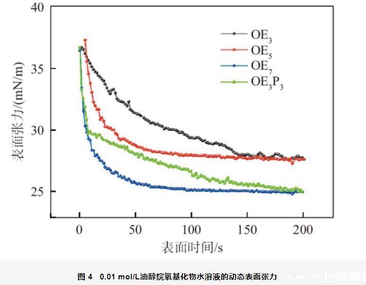 图3不同浓度的OE3水溶液在25℃时的动态表面张力
