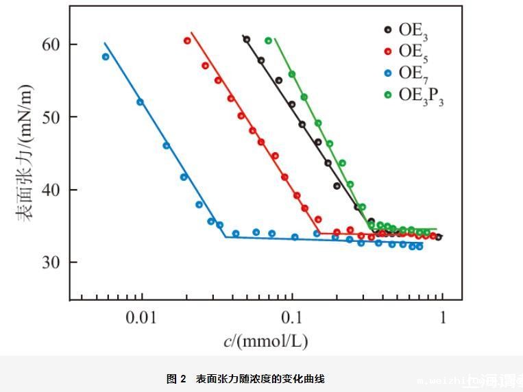 OEn的Amin值分别为31.17,31.65和33.23?2(见表2),其值随着EO加合数的增加变化不大,但呈现逐渐增大趋势,而Γmax变化呈相反的趋势。这是因为随着分子中EO数的增多,EO链形成卷曲结构使单个表面活性剂分子头基的体积增大,进而引起在界面处达到饱和状态时表面活性剂分子数目减少;但同时因为OEn分子中EO加合数相差不大,因此OEn的Amin值和Γmax值整体上变化不大。OEn的Amin值比课题组以前合成的OEnS(n=3,5,7)的Amin值(81.62~125.79?2)小[19],这是因为本文中的OEn为非离子表面活性剂,而OEnS是典型的阴离子表面活性剂,由于亲水头基之间强的相互排斥作用,使得OEnS分子在空气/水在界面上的聚集相对分散一些,从而使得Amin值增大。由表2可以看出,?Gmic和?Gads都为负值,说明吸附和胶束化过程都是自发的过程,而?Gads要比?Gmic的值更负,说明在水溶液中吸附过程要比胶束化过程更容易进行。OEn的?Gmic和?Gads都随着EO加合数的增加而更负,说明随着EO加合数的增大,OEn更容易在界面上吸附和在水溶液中形成胶束。从表2中还可以看出,OE3P3的表面活性参数与OE3相差不大,说明在OE3的结构中引入3个PO基对其表面性能的影响不大。