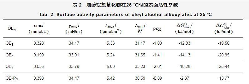 表2油醇烷氧基化物在25℃时的表面活性参数