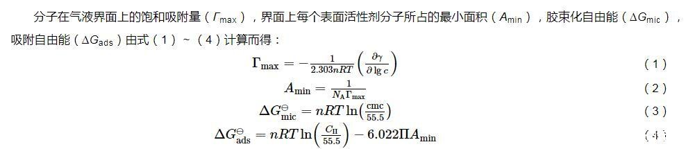 分子在气液界面上的饱和吸附量(Γmax),界面上每个表面活性剂分子所占的最小面积(Amin),胶束化自由能(?Gmic),吸附自由能(?Gads)由式(1)~(4)计算而得: