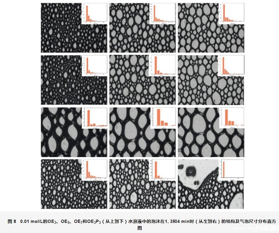 图8 0.01 mol/L的OE3、OE5、OE7和OE3P3(从上到下)水溶液中的泡沫在1,3和4 min时(从左到右)的结构及气泡尺寸分布直方图