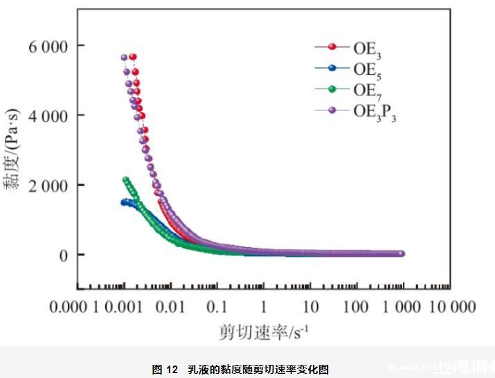 4)以4种油醇烷氧基化物为乳化剂制备的乳液都形成了层状液晶,流变性测试结果表明4种乳液都属于剪切变稀体系且加入OE3的乳液体系具有较好的稳定性。